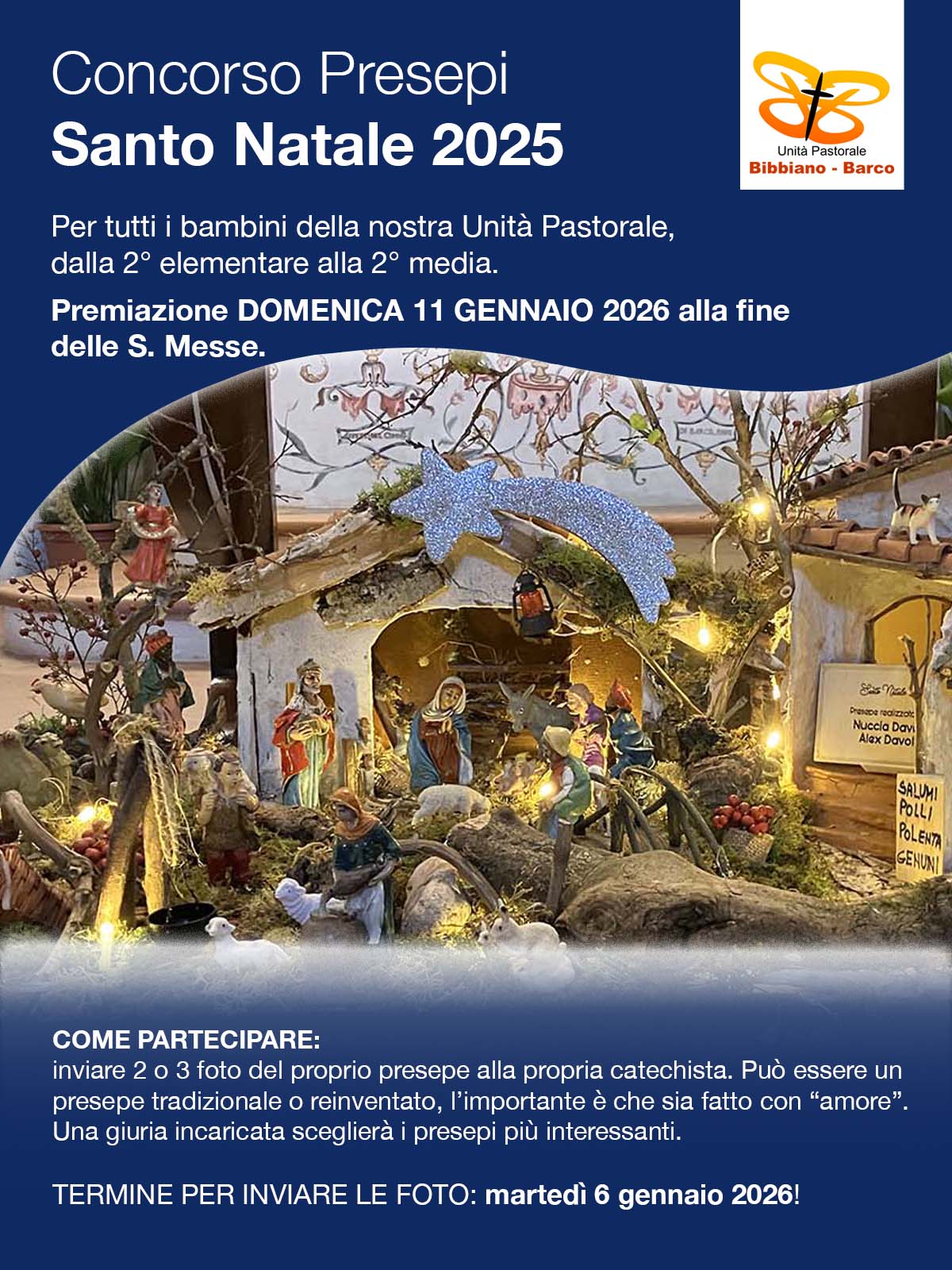 Domenica 11 gennaio al termine della Santa Messa delle ore 10.00 a Bibbiano e a quella delle ore 11.30 a Barco, ci saranno le premiazioni dei presepi realizzati dai ragazzi del catechismo della nostra Unità Pastorale.