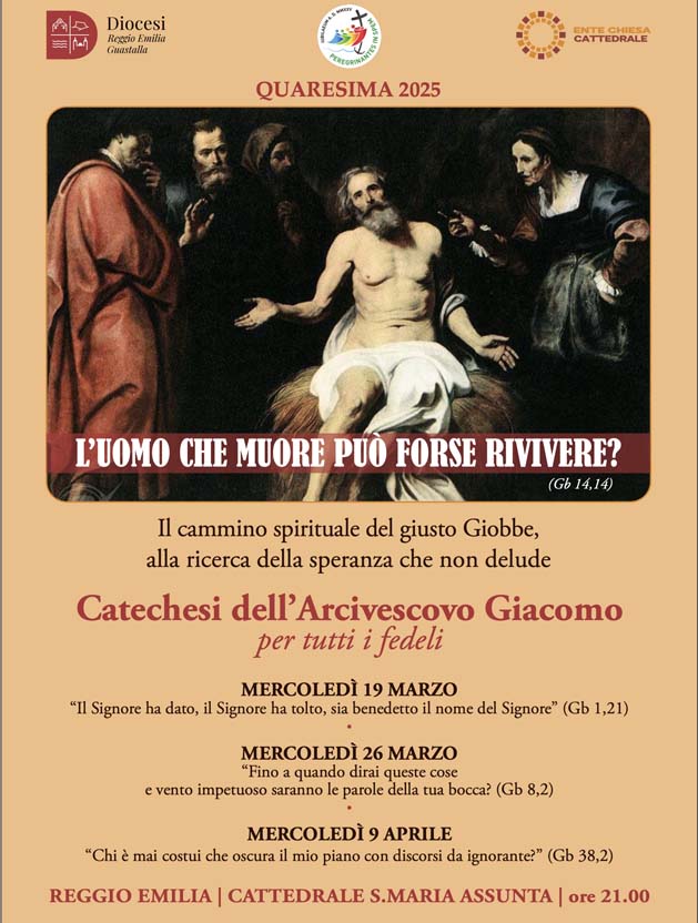Mercoledì 9 aprile si è concluso il ciclo di catechesi con il vescovo Giacomo. Nei tre incontri del 19, 26 marzo e del 9 aprile, il vescovo ha ripercorso il “cammino spirituale del giusto Giobbe, alla ricerca della speranza che non delude”. Gli incontri si sono svolti in cattedrale a Reggio Emilia.