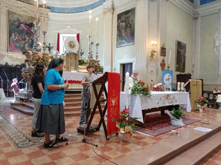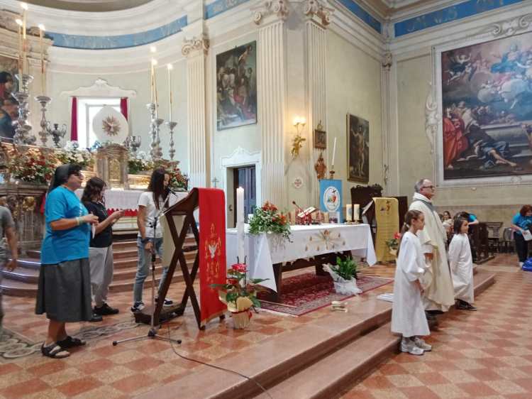 Hanno concelebrato la S. Messa don Wojciech e don Claudio Gonzaga con l’animazione del CORO Polifonico La Corbella. Prima della celebrazione i bambini della scuola dell’infanzia Il Giardino di Barco hanno dedicato un canto alla B. V. Maria.