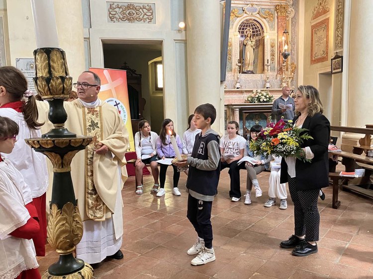 Domenica 11 maggio le bambine e i bambini di quarta elementare di Bibbiano hanno ricevuto il sacramento della Prima Comunione. Ad accompagnarli al sacramento la loro catechista Lucia con l’aiuto di Eleonora, Francesca e Martina.