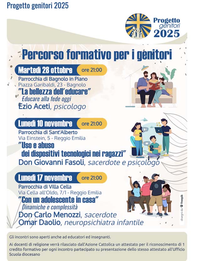 Da fine ottobre a metà novembre si sono tenuti tre incontri per genitori organizzati da Azione Cattolica di Reggio Emilia in alcune parrocchia della nostra diocesi. Tema della serata: “La bellezza dell’educare”, tenuta dal dott. Aceti, “Uso e abuso dei dispositivi tecnologici nei ragazzi” con don Giovanni Fasoli, “Con un adolescente in casa, dinamiche e complessità!” con don Carlo Menozzi e il dott. Omar Daolio.