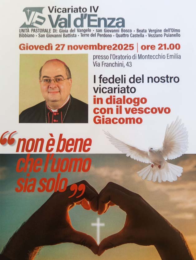 Giovedì 27 novembre il nostro Vescovo Morandi ha incontrato i fedeli a Montecchio E. presso l’oratorio Don Bosco alle ore 21.00. L’ argomento dell’incontro era in continuità con il tema del nuovo anno pastorale dal titolo “Non è bene che l’uomo sia solo” e affrontato nella lettera del Vescovo alla Diocesi.